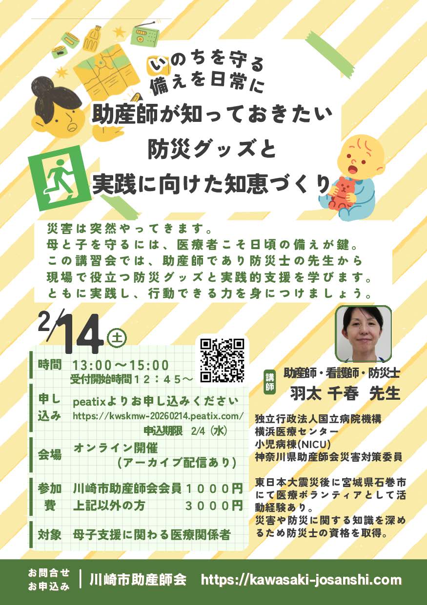 【医療従事者向け研修会】2026年2月14日(日)「いのちを守る備えを日常に~助産師が知っておきたい防災グッズと実践に向けて知恵づくり~」開催します